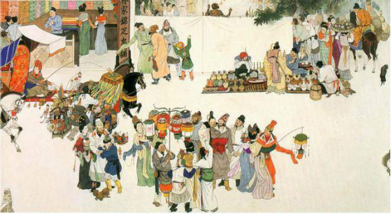 隋唐時(shí)期,除了傳統(tǒng)的戶外廣告,還出現(xiàn)了較為特色的商品展銷會(huì)。為了展示都城的繁華富裕,隋煬帝時(shí)期曾多次在豐都市專門進(jìn)行商品陳列和展示,上面有各種各樣豐富多彩的戶外廣告形式,如旗幟、招牌等等。